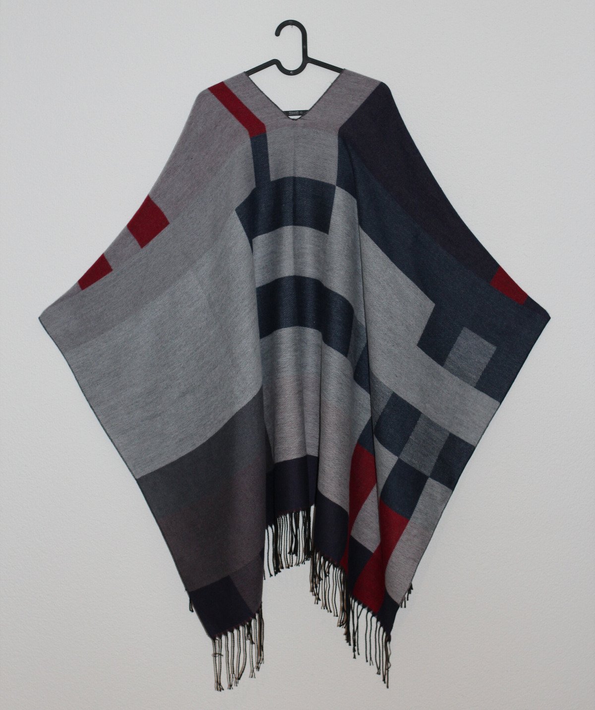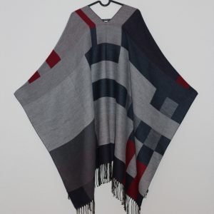 Grau-rot karierter Poncho, hergestellt in Cusco, Peru, aus 80 % Baby-Alpakawolle und 20 % Garn.