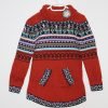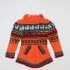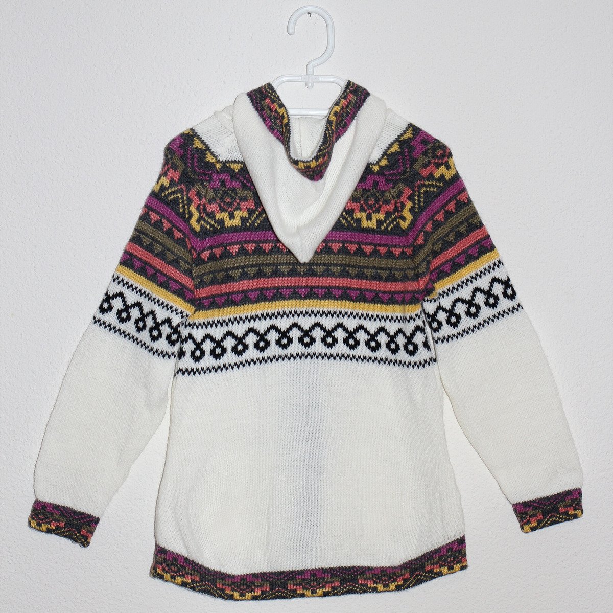 Weißer Pullover mit farbenfrohem Chakanas-Design und durchgehendem Reißverschluss in der Mitte, hergestellt in Cusco, Peru, aus 60 % Alpaka-Wolle und 40% Schafwolle.