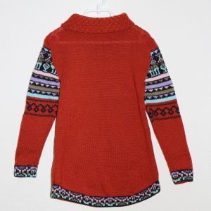 Ziegelroter Pullover mit geschlossenem Kragen, Alpaka-Motiv, Chakanas und mehrfarbiger Blume an der Seite, hergestellt in Cusco, Peru, aus 60 % Alpaka-Wolle und 40 % Schafwolle.